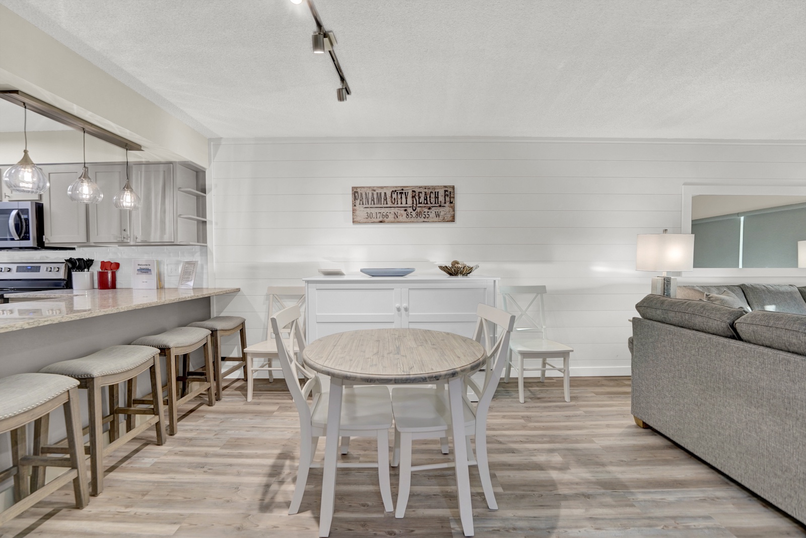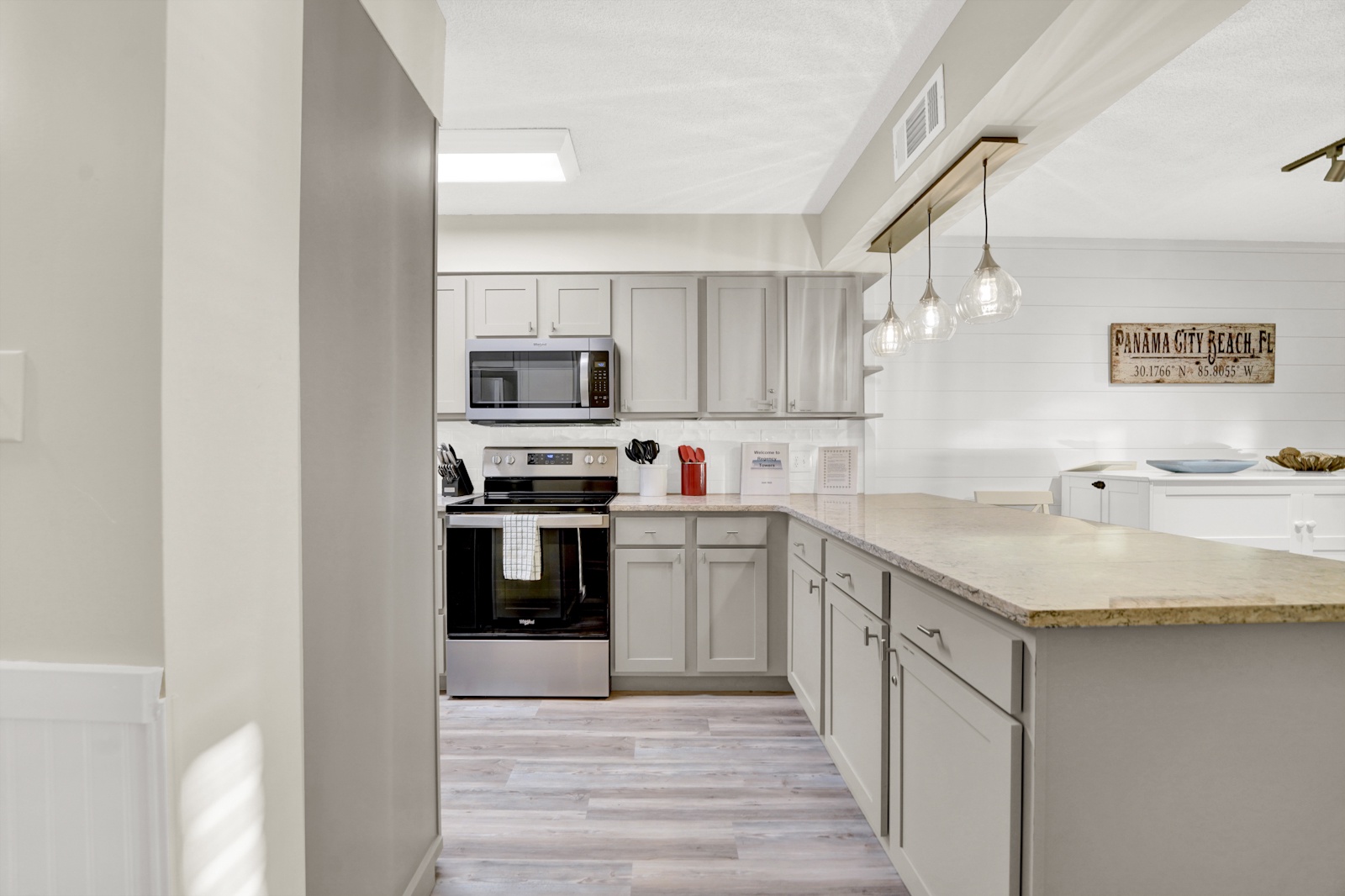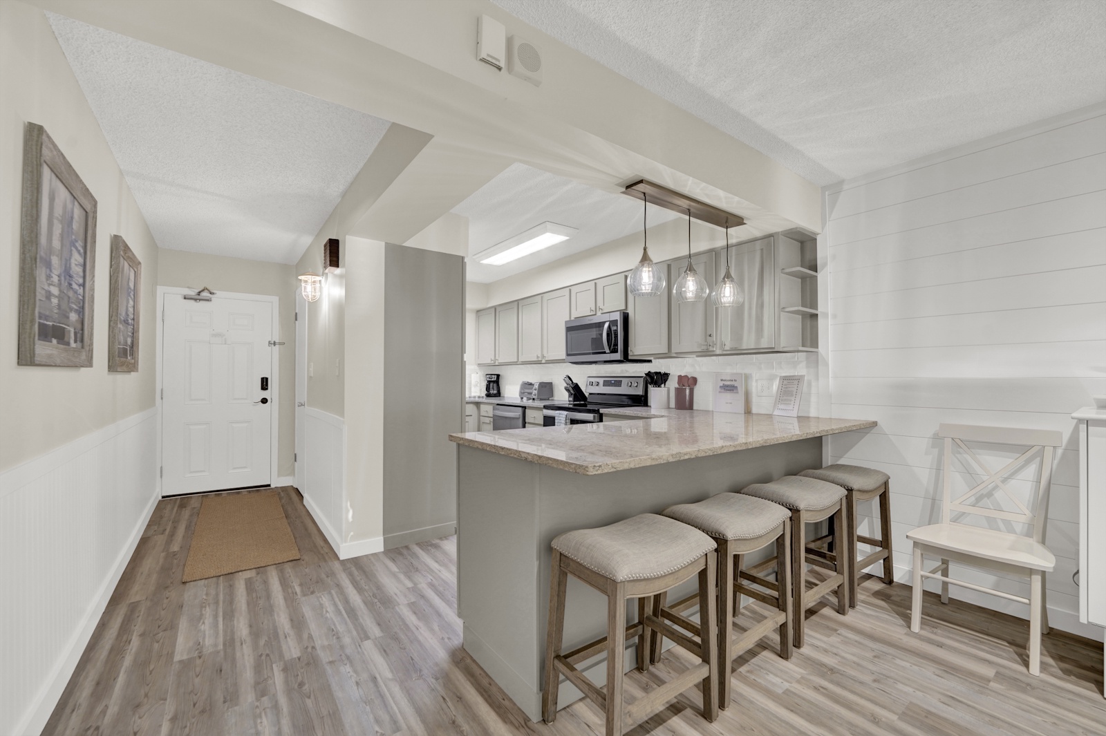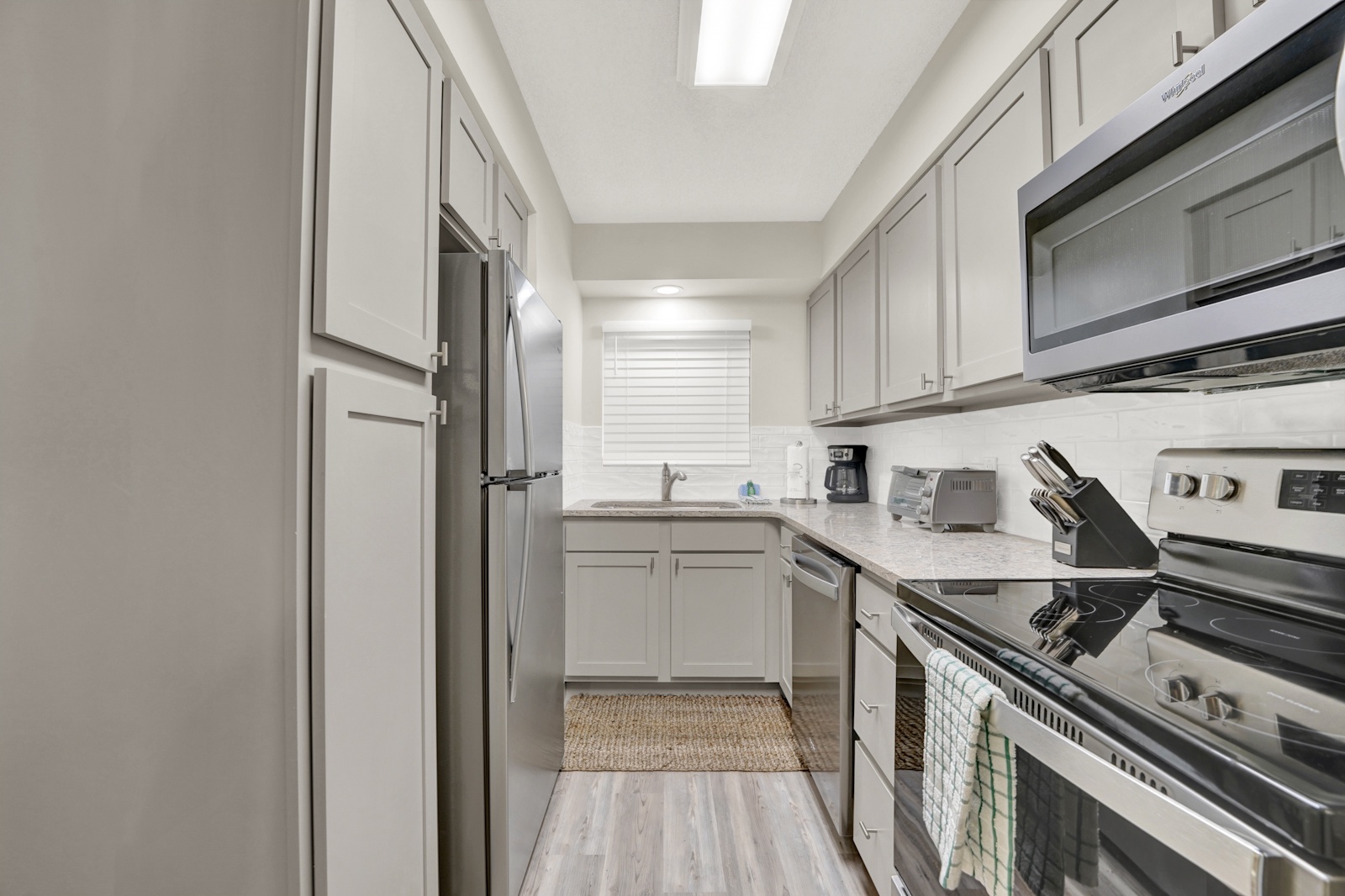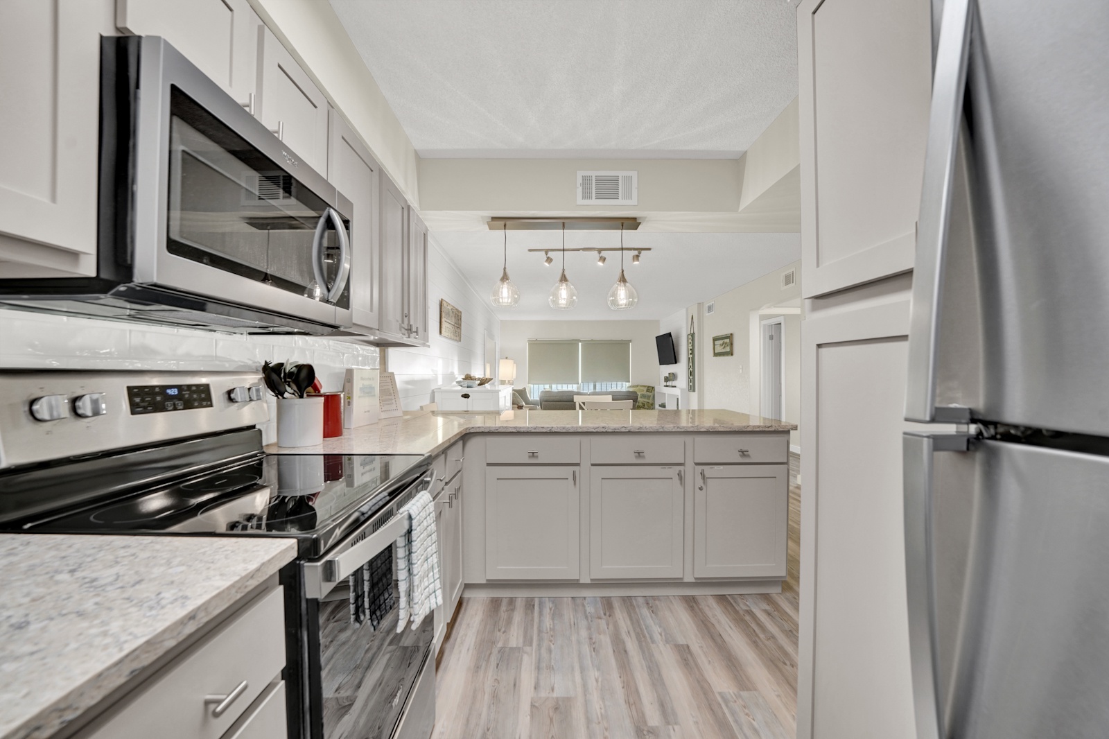 The Kitchen has new appliances and a beautiful expanded quartz countertop for preparing and eating meals.