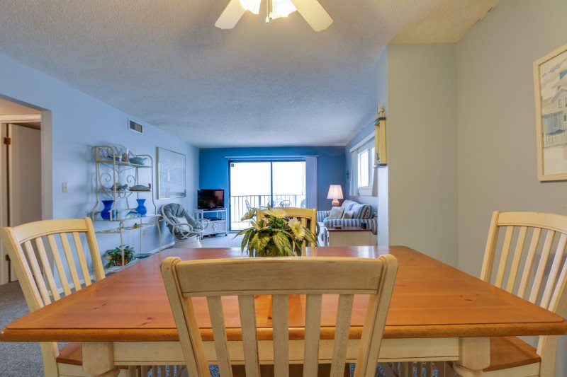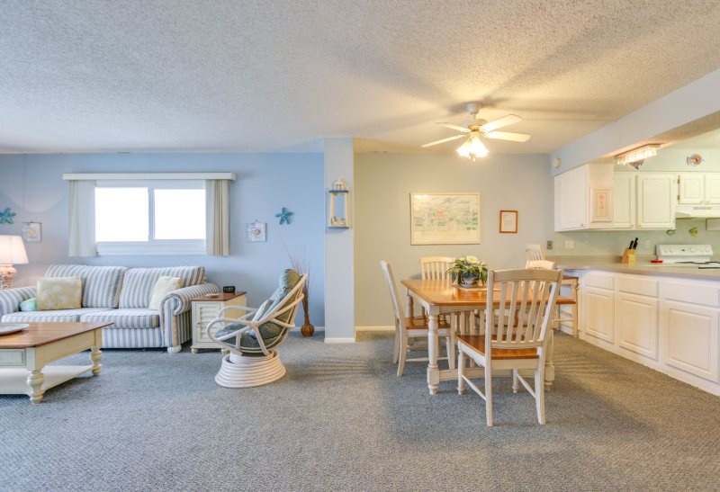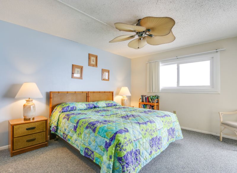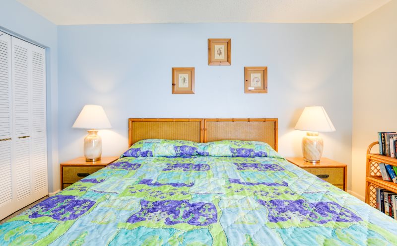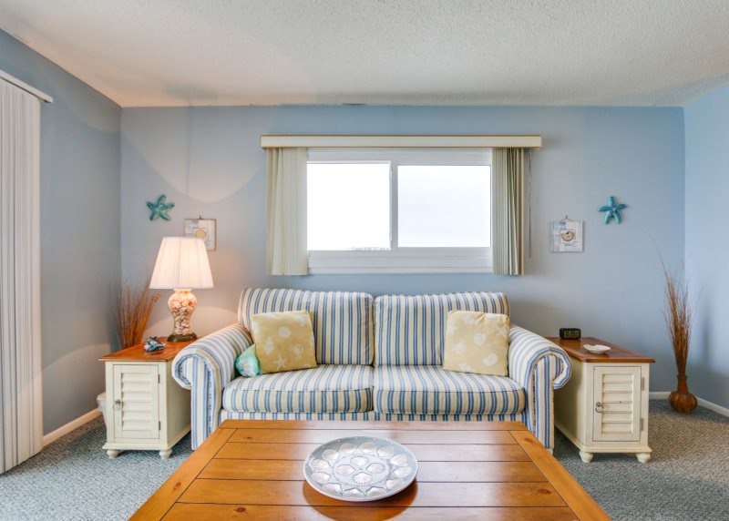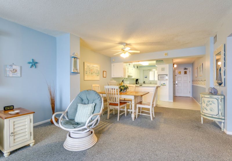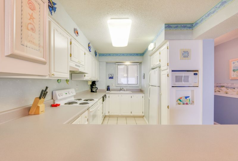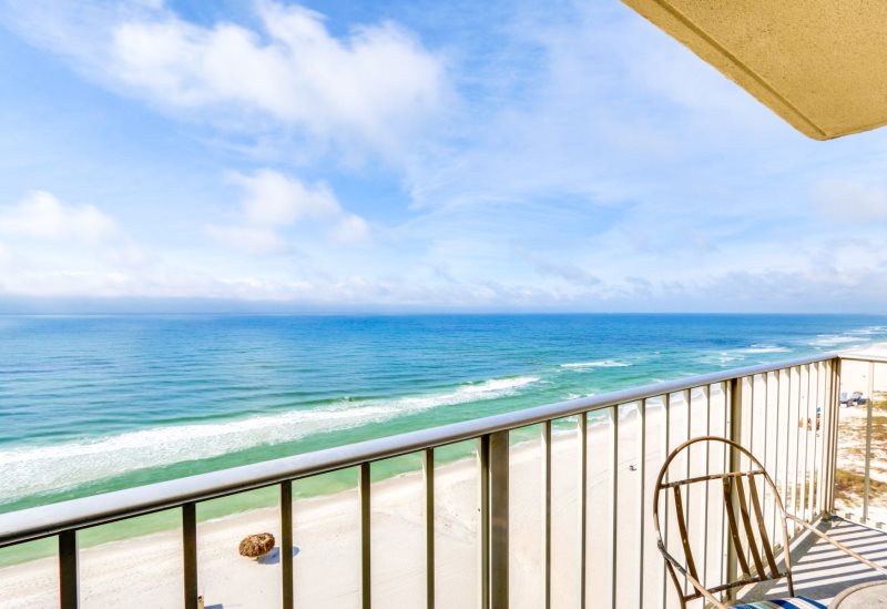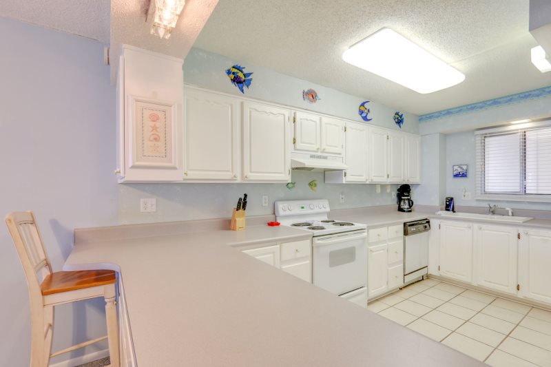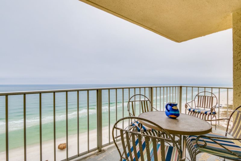 Imagine yourself high on the 12th floor of a high rise building gazing out at the blue green gulf and its colorfully stunning sunsets! For that is exactly what you will find at this condo. This unit looks westward for an incredible sunset each and every evening! This newly remodeled condo is simply charming with its 1 bedroom 2 bath condo that accommodates four (4) people. Sit on your private balcony and watch the waves kissing the shoreline, people playing in the surf, and dolphins swimming by. This is stylishly decorated in peaceful seashore colors of blue, white and pale yellow with neutral carpeting in every room but the kitchen which is tiled in white. The dining table easily accommodates four (4) people and there are barstools for overflow seating. The sofa doubles as a bed and the living room opens to the private balcony, as does the master bedroom. There are two TV’s with DVD/VCR players. The master bedroom provides a king size bed with a palm leaf ceiling fan overhead provides a good night’s sleep and the master bath has a beautifully tiled walk-in shower. This unit has a washer and dryer provided for efficiency allowing you to take clean clothes home from your vacation.