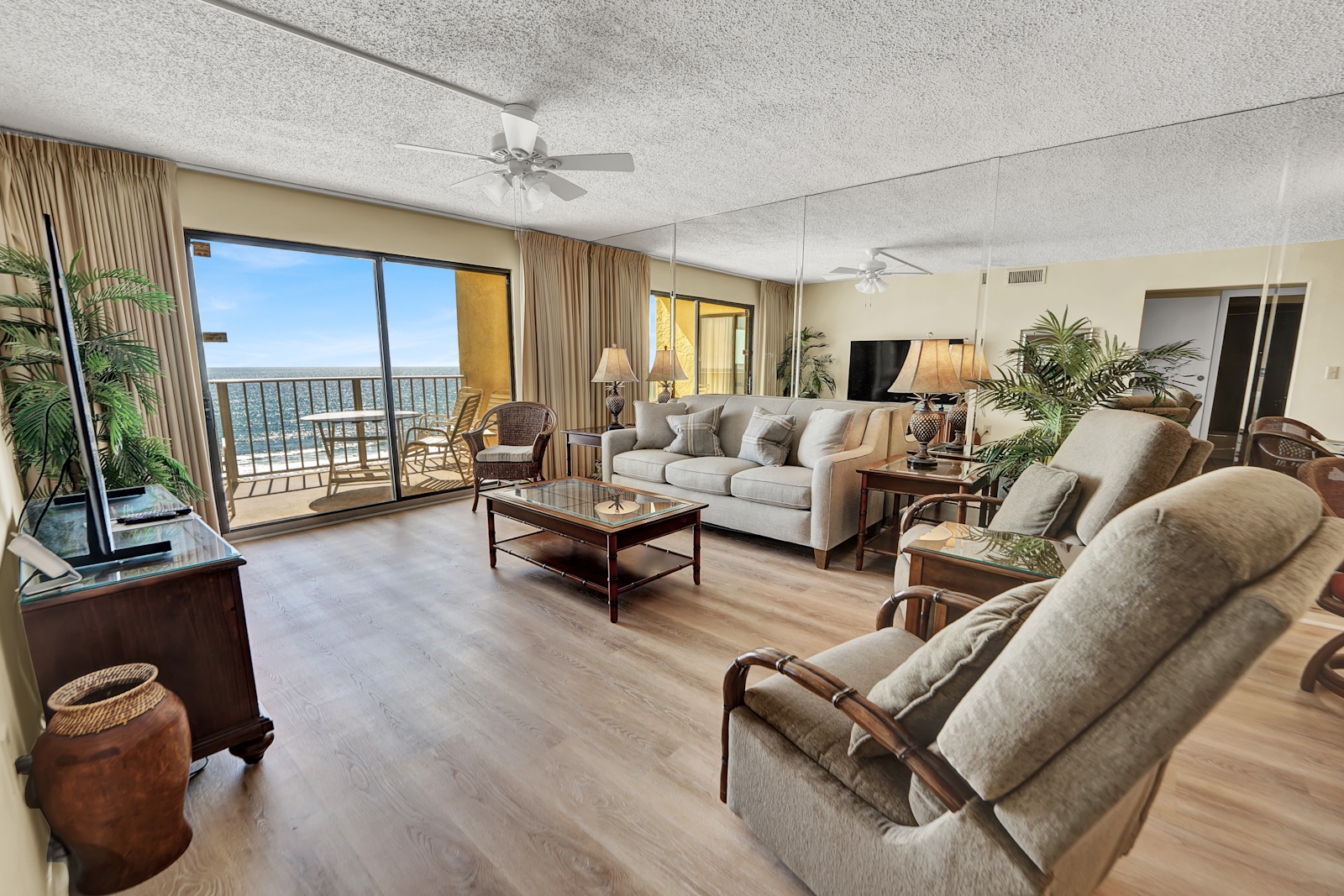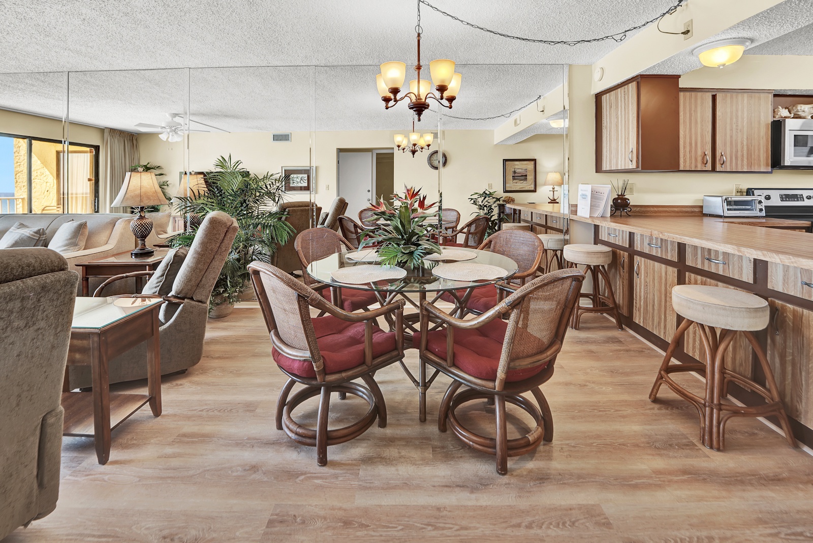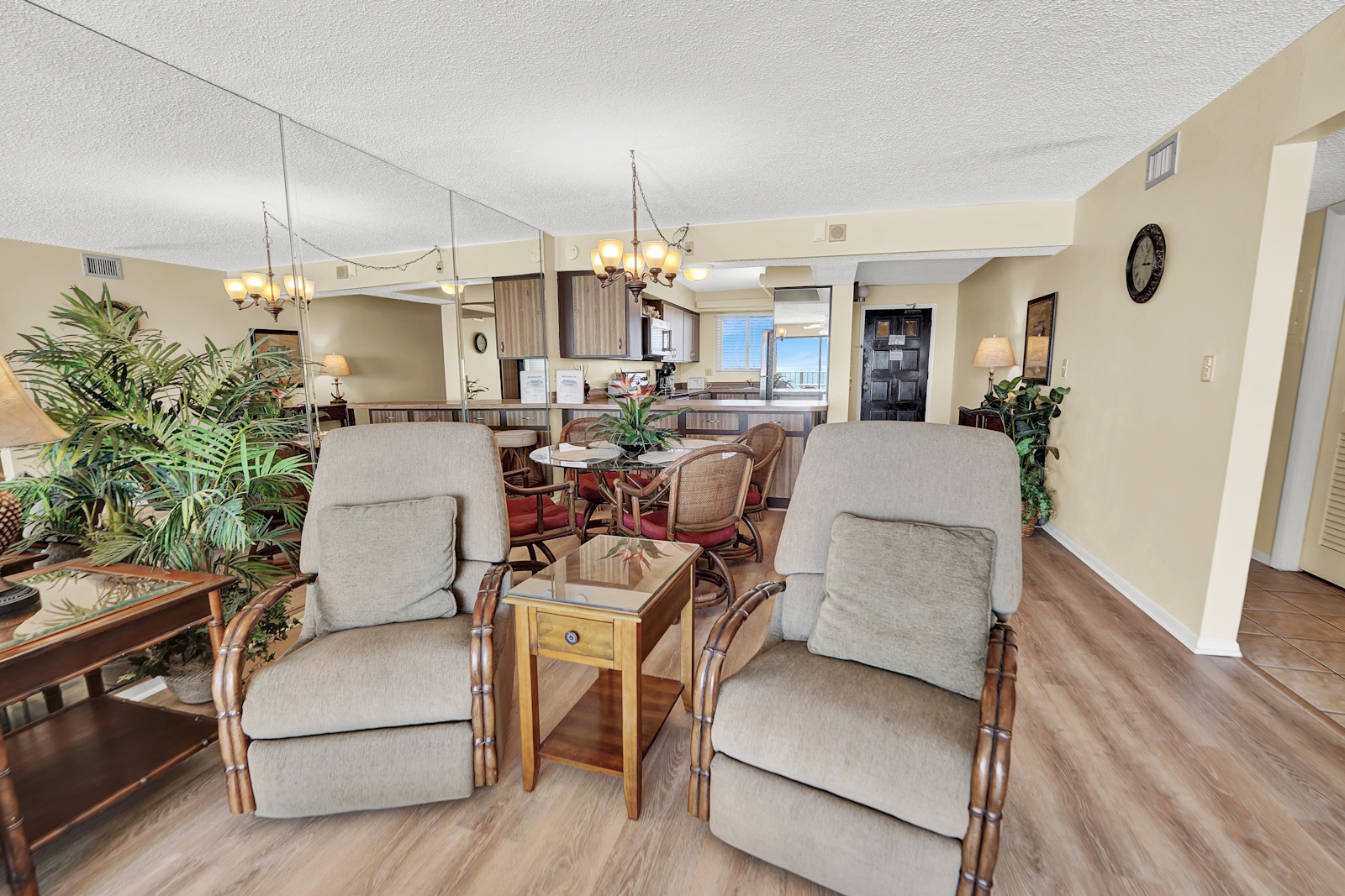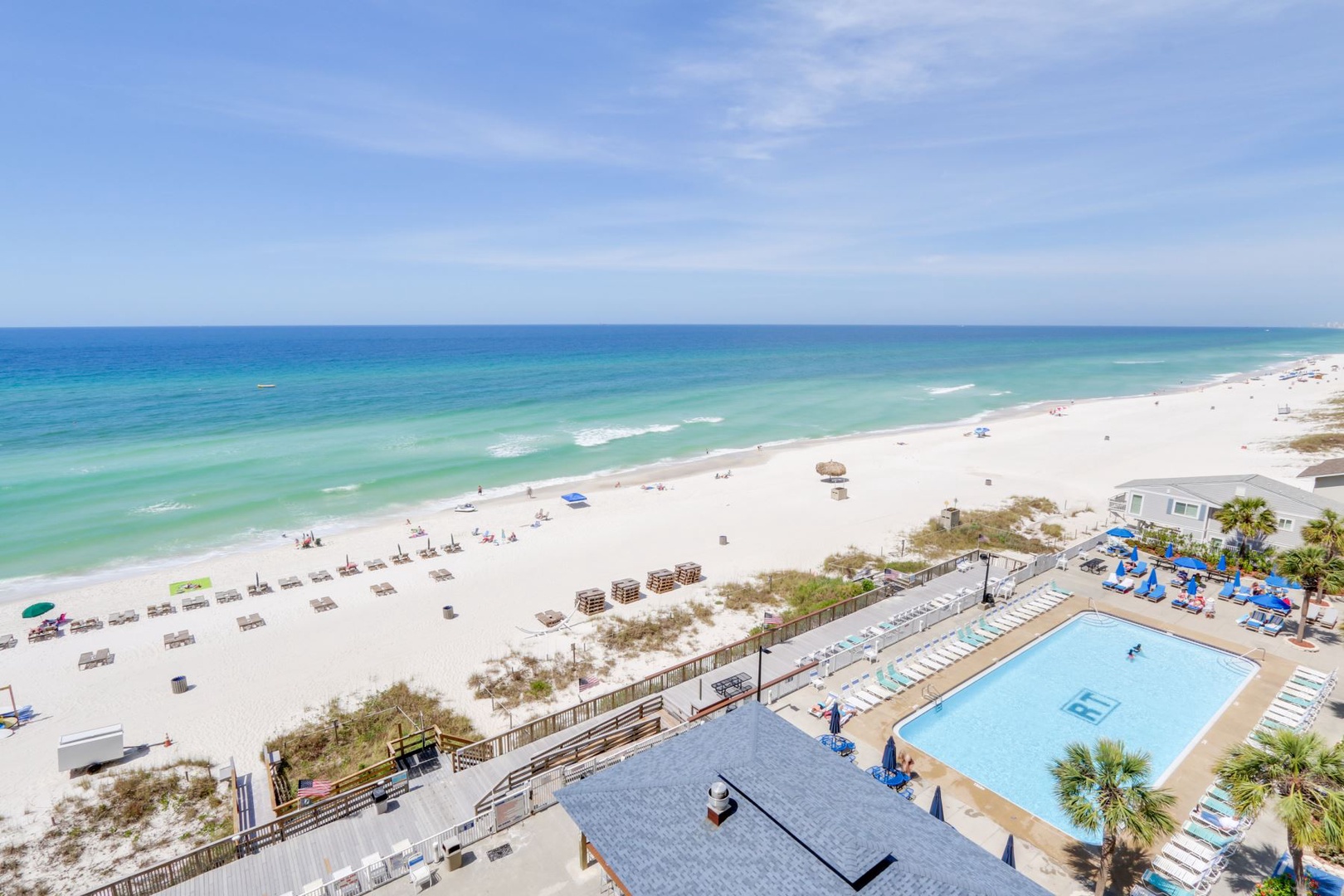 Lovingly decorated in a comfortable, contemporary style you will find this incredible condo with a phenomenal view of the Gulf! This 8th floor condo is a 2 bedroom 2 bath unit that easily sleeps six (6) people. Enter by the galley kitchen and take note of the zebra wood kitchen cabinets and countertops and the stainless steel appliances making meal preparation a breeze. The dining table seats four and there are bar stools for overflow seating. The living room with a large flat screen TV and DVD Player has abundant seating and the sofa doubles as a queen size bed. But, the view…..Ahhhhh, the view is phenomenal and to be coveted. The private patio opens from the living room and the master bedroom. The master bedroom provides a king size bed and a walk-in shower with elegant tilework. The 2nd bedroom offers two (2) twin beds and both bedrooms are equipped with a TV and DVD Player. It also has a washer and dryer provided for efficiency allowing you to take clean clothes home from your vacation.